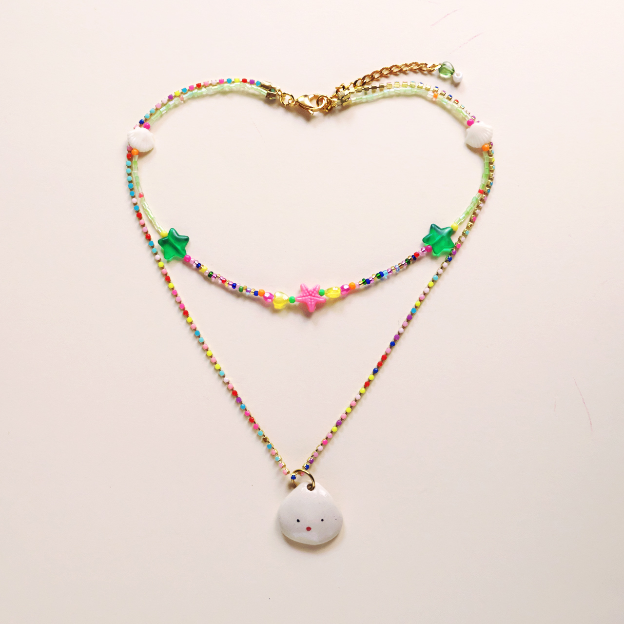 A cute One-of-a-kind Ceramic sea shell-shaped pendant with two girly beaded chains.